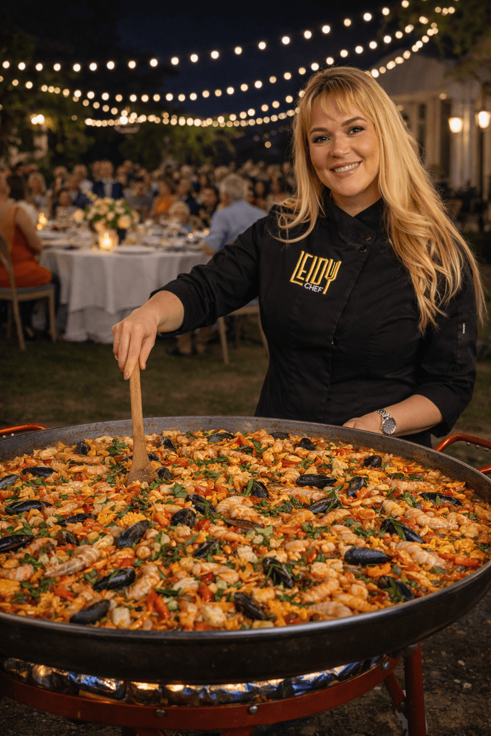 La Paella de Chef Leidy simplemente es la mejor. Mi favorita es la de Mariscos pero tiene opciones hasta para gente veggie. Ah claro, a parte de la Paella en vivo, las mesas de quesos y salumería es la más deliciosa y bonita que podrás ver.